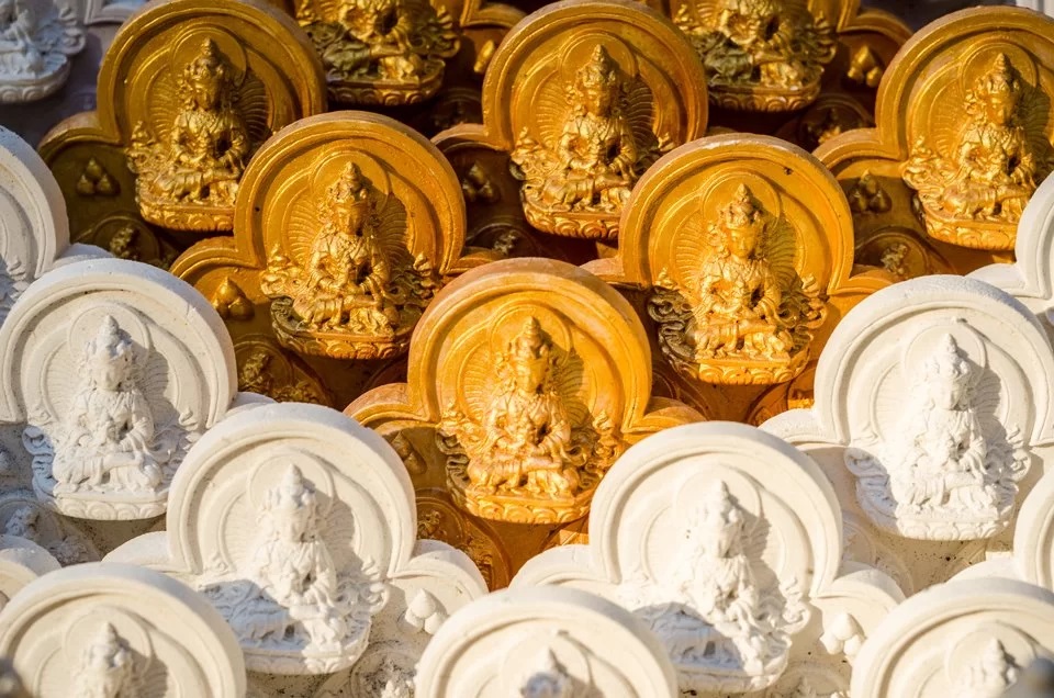 Cette année, la retraite de purification de Vajrasattva fera appel à deux méthodes pour pratiquer la force du remède : d’une part la récitation de mantras, et d’autre part la réalisation de tsatsas. Il s’agit de petits moulages en plâtre que nous réaliserons lors d’un rituel particulier et qui seront ensuite peints en doré.