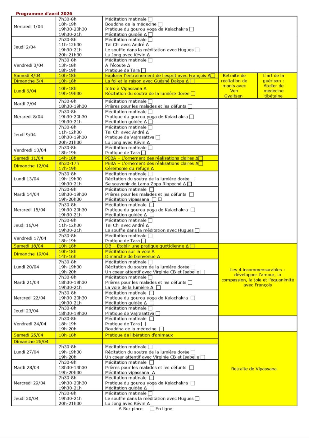 • Du 17 avril au 23 avril, François guide une retraite pour développer les 4 incommensurables : un Amour bienveillant, une Compassion, une Joie empathique, une Équanimité infinis.